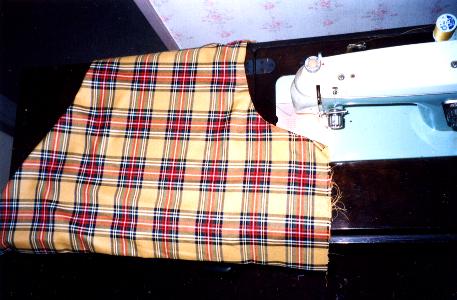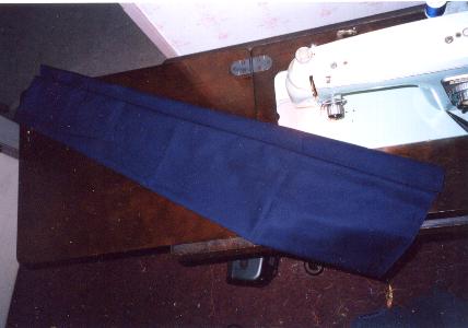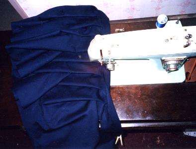 続いて、スカートの製作。 生地は4m使用しています。 プリーツの折り込みは15cmで折り返し、 次に10cmでまた折り返しています。 これを16回繰り返すと、4m分を消化できます。 |
