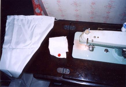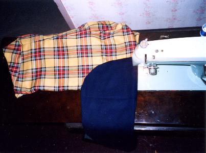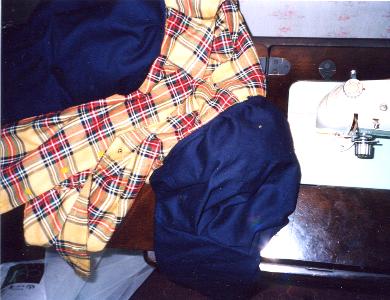 上着部分の最終工程。 肩の「ふわっ」とした部分の縫いつけ。 内部には、綿を仕込んであります。 仕上げに5個の黄色いボタンを縫い付けて上着は完成。 |