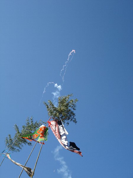 雲一つ無い、まさに絶好の龍勢日和の中 この日の中でもトップクラスの高さまで上がる あの花ロケット花火! |