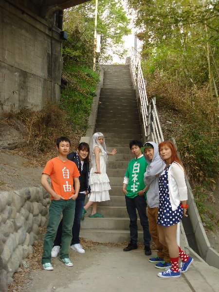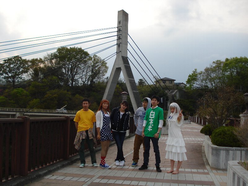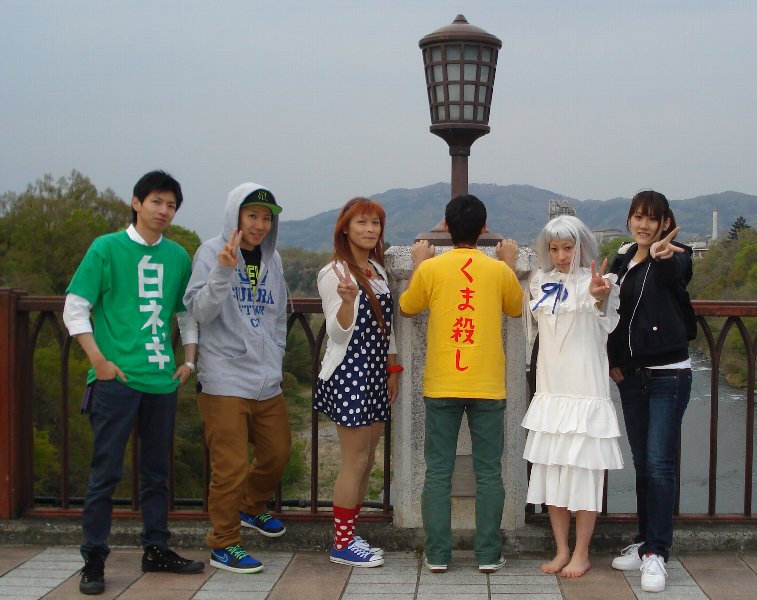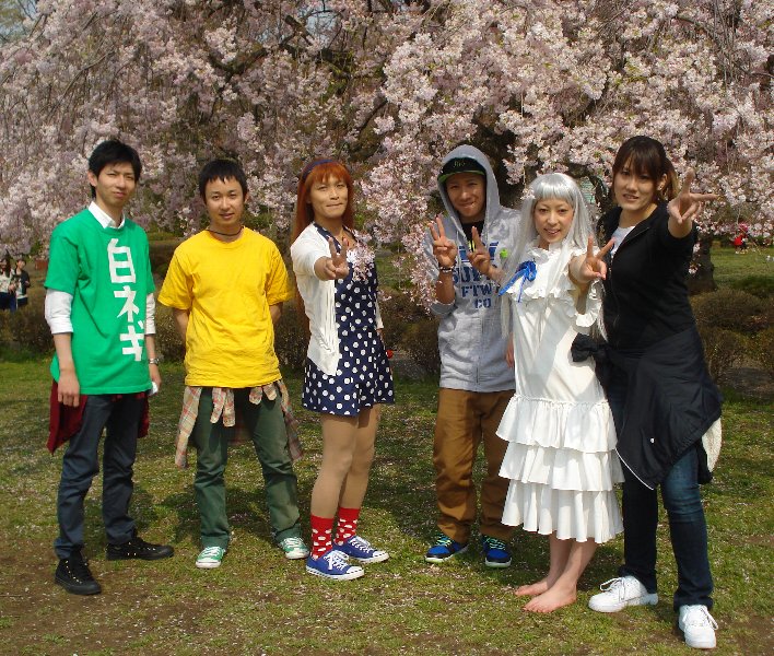 そして、芝桜の公園では・・・・ なんと「枝垂れ桜」が満開でしたっ! 今回コスプレはしていませんが、めんまちゃんのとなりが「ユータ」さんと「みーちゃん」です。 この6人で、その名も「超平和バスターズ」を結成して遊んでいます。 |