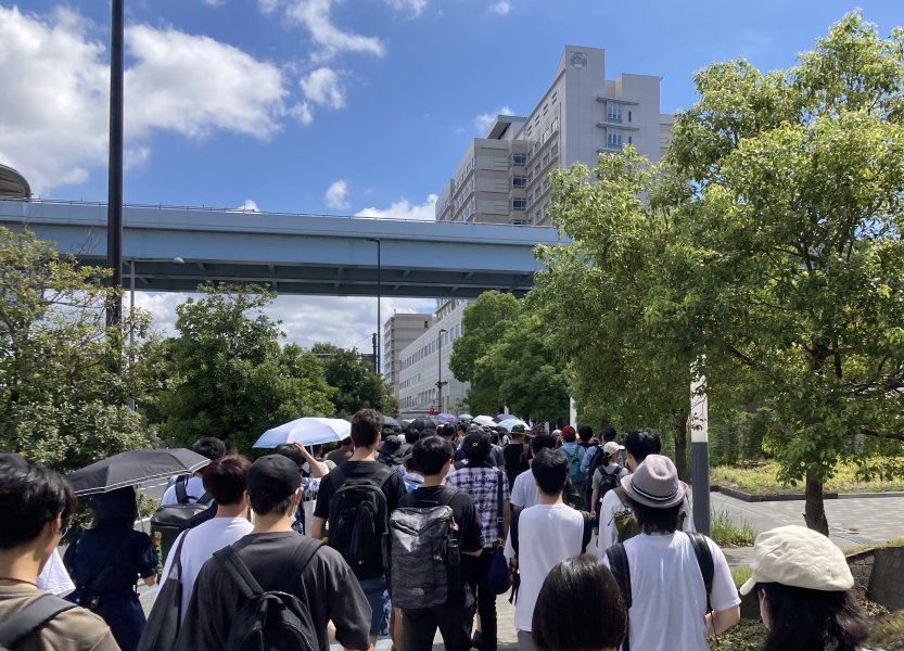 歩道を整然と歩く参加者たち。 |