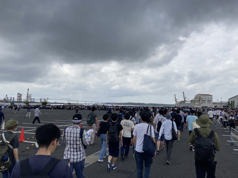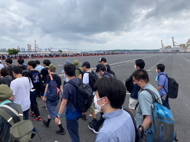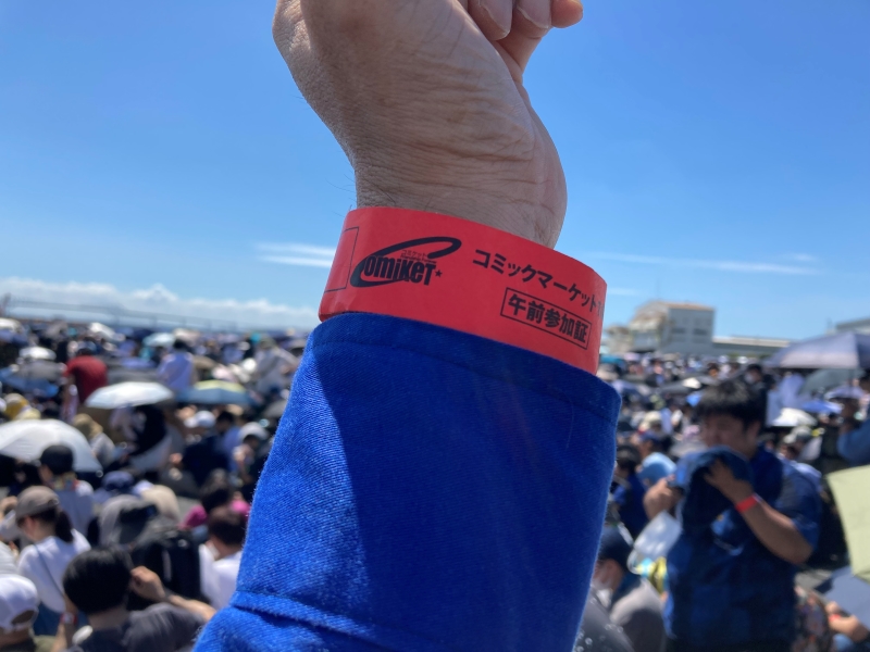 一日目のリストバンド装着。 炎天下ですが、入場まで待ちますか。 |
