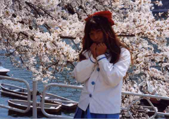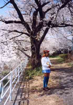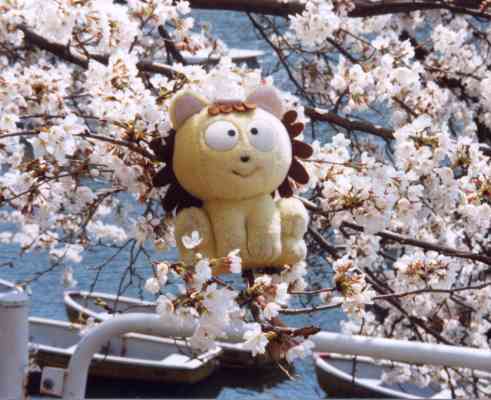 桜越しに写る湖は綺麗ねぇ、ポコ太。